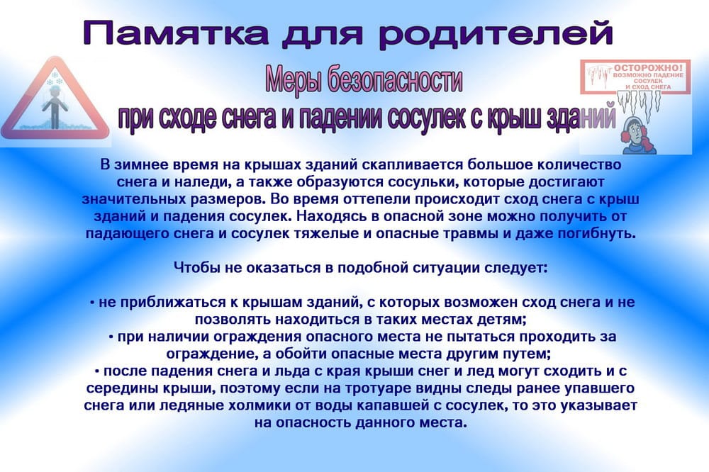 При больших снегопадах и оттепели выходя из зданий, не задерживаться на крыльце, а быстро отходить на безопасное расстояние от здания (5 метров). Входя в здание обязательно поднять голову вверх, и убедиться в отсутствии свисающих глыб снега, наледи и сосулек.