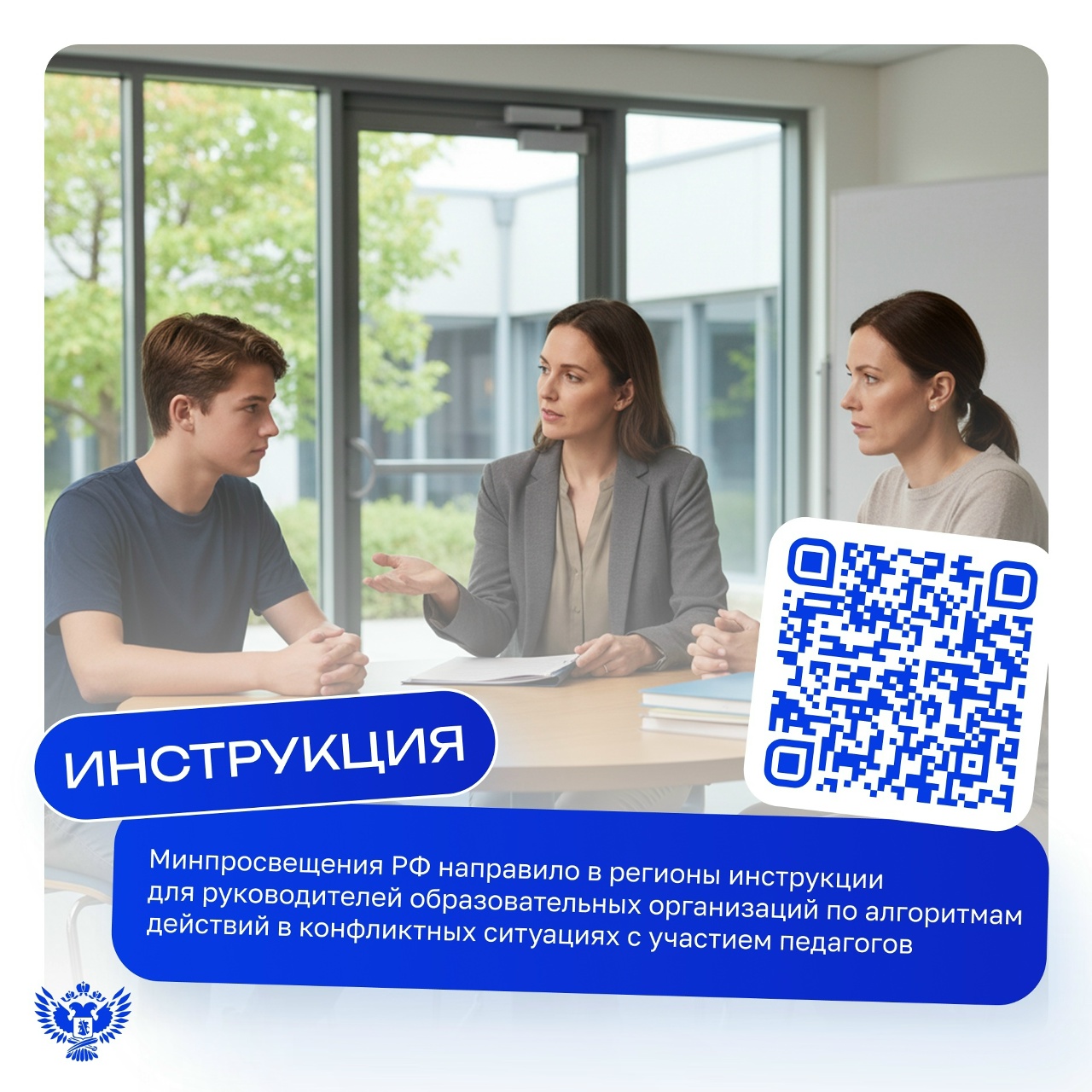 Министерство просвещения Российской Федерации направило в регионы инструкции для руководителей образовательных организаций по действиям в конфликтных ситуациях у педагога. Документ был одобрен на заседании Совета Минпросвещения России по защите профессиональной чести и достоинства педагогических работников.